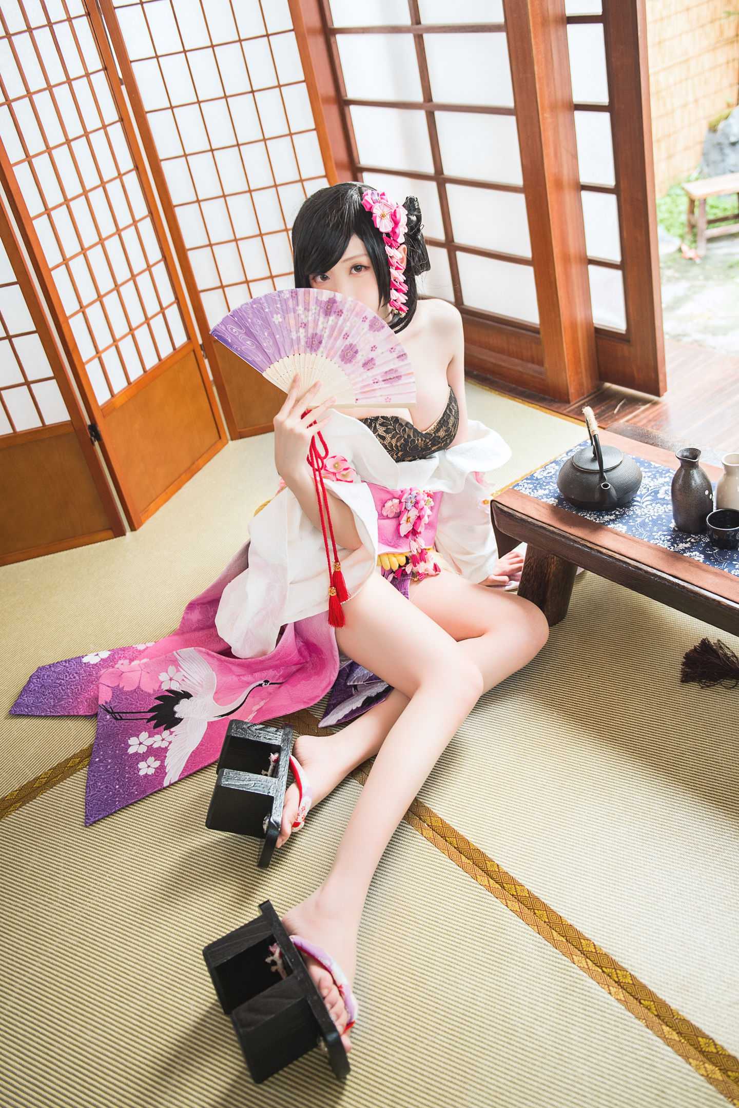 视线也随着垂落下来的布料看见那一双纤细白皙的双腿,虽然在心理上早已经打过预防针,但是看见实体后依旧抵挡不住它使人沉沦的魅力。跪坐在地板上的姿态更是将妖娆写尽,当她真正站起身的时候才方能看见全貌,尤其是她微微向前屈膝的动作让一道美妙的弧线也顿时被勾勒了出来。手中举着的一把木伞依偎着她的肩膀,即使没有下雨但雨后出现的清新气味却散发了出来,只是沉浸在氛围中的片刻后看见伞边她俏丽的脸庞,心脏便也好似漏了几个节拍,一头乌黑是秀发上粉红色的发髻点缀在她的左侧,让她看起来不仅年轻了几分,矜持的淑女气息便也就扑面而来了。